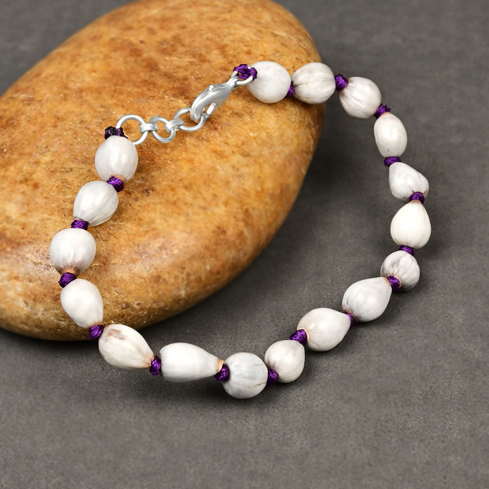 This bracelet features smooth, natural white Vaijayanti beads, carefully knotted with purple thread for a secure and stylish fit. The bracelet is finished with a sturdy clasp, making it easy to wear and adjust. The Vaijayanti mala is a symbol of divine grace and victory in Hindu tradition, especially associated with Lord Vishnu. Wearing this bracelet brings positive energy, spiritual protection, and a deeper connection to higher consciousness. It serves as a powerful reminder of divine blessings and the triumph of good over evil.