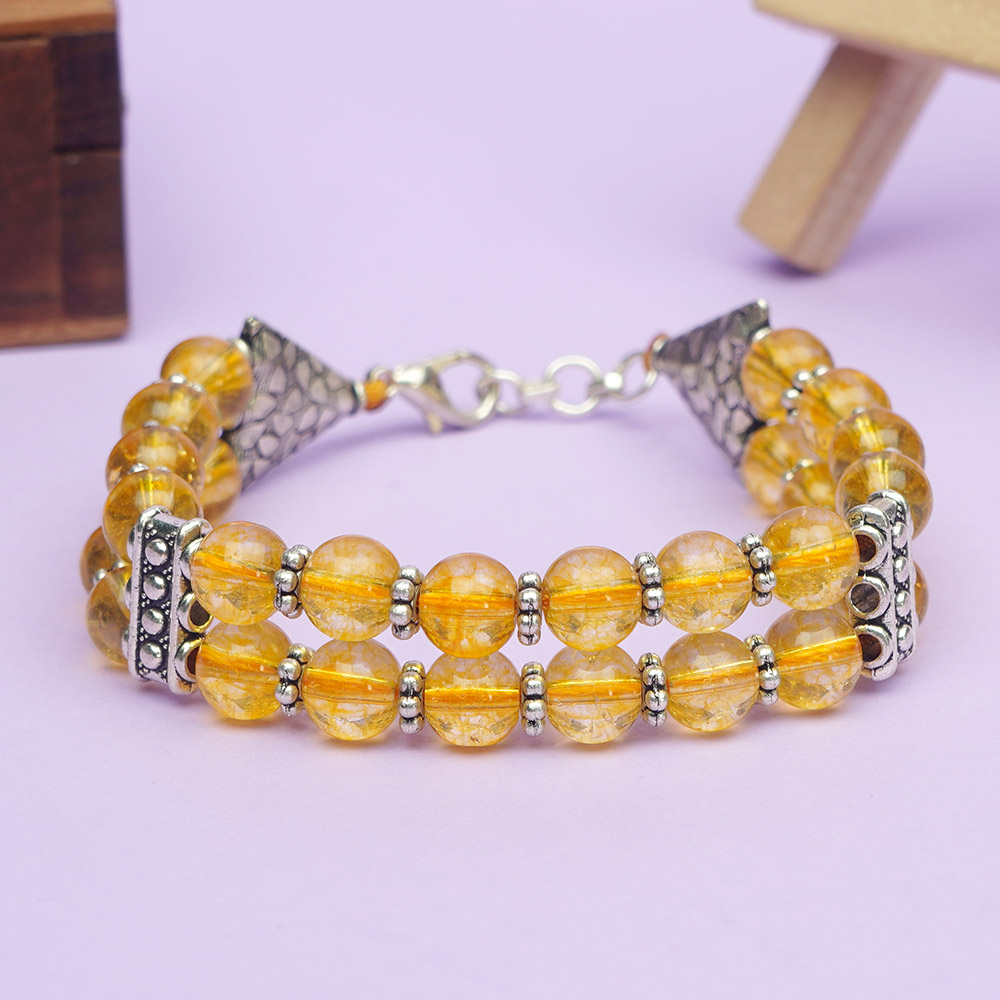 This elegant bracelet is crafted with two rows of natural Yellow Citrine beads, joined together with intricately patterned German silver spacers and triangular end connectors. Each faceted bead showcases internal shimmer and clarity, while the designer elements add structural grace. The bracelet is secured with a sturdy clasp and adjustable chain for a comfortable, reliable fit. Yellow Citrine is renowned as the stone of abundance and mental clarity. It energizes the wearer with confidence, clears emotional blocks, and helps manifest prosperity. The dual-layered design amplifies its energy flow, making this bracelet a perfect blend of style and spiritual function for those seeking success, focus, and radiant positivity.