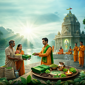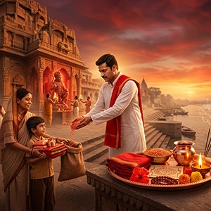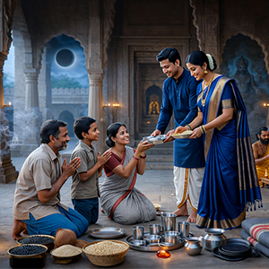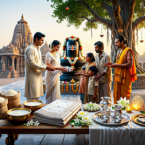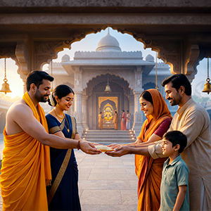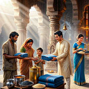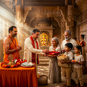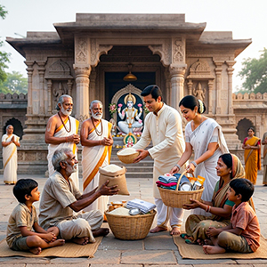 In Vedic tradition, significant acts of giving include feeding Brahmins, charitable donations, and caring for animals. By feeding Brahmins, making donations, and looking after animals, individuals can invoke divine blessings and alleviate doshas (planetary imbalances), which helps cleanse past karmas.  Such deeds are particularly beneficial for those seeking success and inner peace, as they align the donor with the virtues of kindness and gratitude. Rudra Centre offers a collection of essential acts, such as Brahmin bhoj (feeding Brahmins), charity, and feeding animals, to mitigate the malefic effects of planets, gain wealth, achieve success, cleanse past karmas, and provide spiritual upliftment.