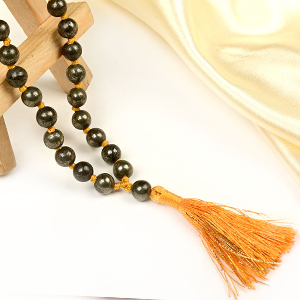 Collection of Pyrite Malas in exquisite designs and stringing patterns. Pyrite, also known as “Fool’s Gold,” is a powerful gemstone associated with abundance, confidence, and protection. This stone resonates with the Solar Plexus Chakra and is believed to attract wealth, success, and prosperity to the wearer. The Pyrite Mala acts as a shield against negative energies and environmental pollutants. It enhances willpower, motivation, and the ability to manifest goals. Wearing a Pyrite Mala helps boost self-confidence, focus, and mental clarity, empowering the wearer to take decisive action and overcome obstacles with courage.